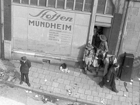 Er waren obstakels, paaltjes of zo, en daar vielen ook mensen overheen, ik ook. Ik moet ergens in het midden hebben gelegen, mensen onder en boven me, mensen die over mij vielen en ik over hen… Via de Nieuwendijk kwamen we in een confectiezaak. Ik was niet gewond maar er zat bloed van andere mensen op mijn jasje. Ook was ik een schoen kwijt. Via een grote omweg kwam ik thuis aan de Haarlemmerweg, terwijl er ook nog een schietpartij was op de Amstelveenseweg.