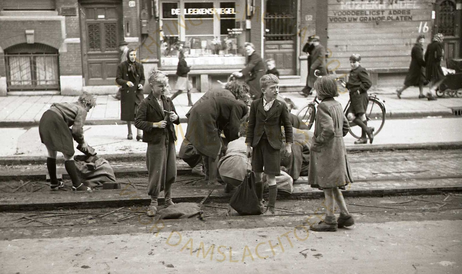 Ook heb ik blokjes tussen de tramrails uitgehaald, het teer dat er in zat brandde goed in de kachel. Maar ik werd gesnapt en werd een dag werd vastgehouden op het politiebureau in de Spaarndammerstraat. Dat was niet leuk voor een meisje van 17 jaar. Gelukkig mocht ik aan het eind van de dag naar huis.