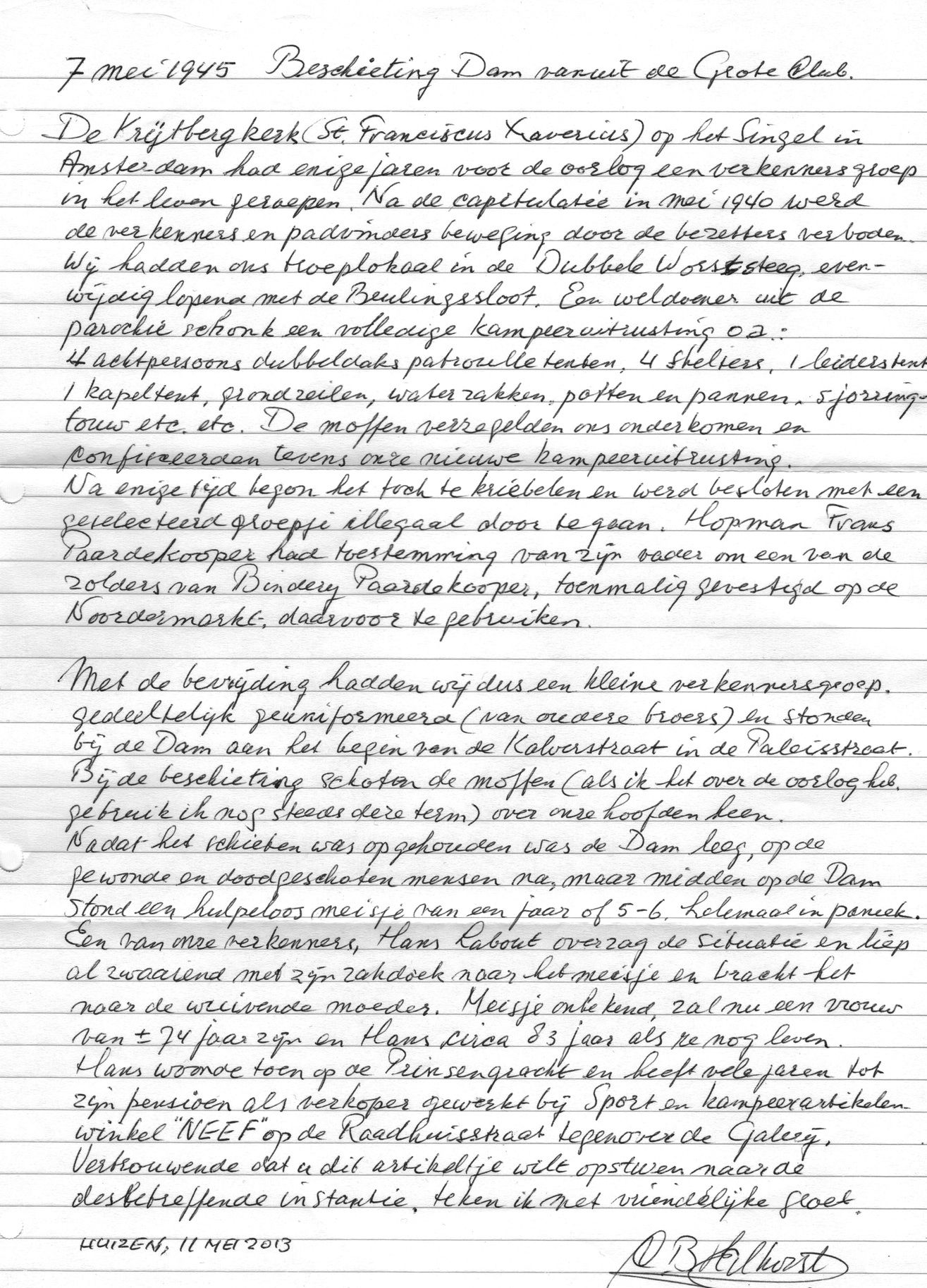 Nadat het schieten was opgehouden was de Dam leeg, op de gewonde en doodgeschoten mensen na, maar midden op de Dam stond een hulpeloos meisje van een jaar of 5-6, helemaal in paniek. Een van onze verkenners, Hans Labout overzag de situatie en liep al zwaaiend met zijn zakdoek naar het meisje en bracht het naar de wuivende moeder. Meisje onbekend, zal nu een een vrouw van ong. 74 jaar zijn en Hans circa 83 als ze nog leven. Hans woonde toen op de Prinsengracht en heeft vele jaren tot zijn pensioen als verkoper gewerkt bij Sport en Kampeerartikelen winkel “NEEF” op de Raadhuisstraat tegenover de Galerij.