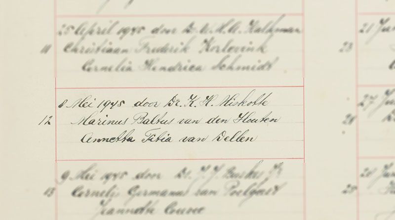 Annette Titia van Dellen (1918-2002) trouwt op 8 mei 1945 in Amsterdam met Marinus Baltus van den Houten (1918-1996). Eerst op het gemeentehuis, daarna de kerkelijke inzegening in de Nieuwe Kerk door ds. K.J. Miskotte.
