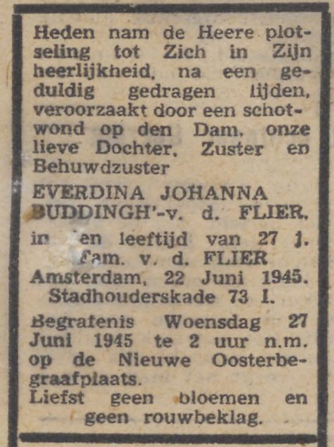 De ouders van achternicht Jan Goede: “De dochter van het echtpaar van der Flier dat aan de Haarlemmerdijk een bakkerswinkel had, had haar kindje voor oppas naar haar ouders gebracht en was naar de Dam gegaan. Ze is daar gewond geraakt (mijn ouders wisten niet of het schotwonden waren, uw site heeft meer gegevens) en vervolgens thuis verpleegd door o.a. Guus Goede (Guurtje Jacobs Goede, geboren 1905). Mw. Buddingh-van der Flier is later aan haar verwondingen overleden en weer later (1947) trouwde Guus Goede met de weduwnaar Buddingh. Guus Goede was ook een oomzegger van Jan Goede.”