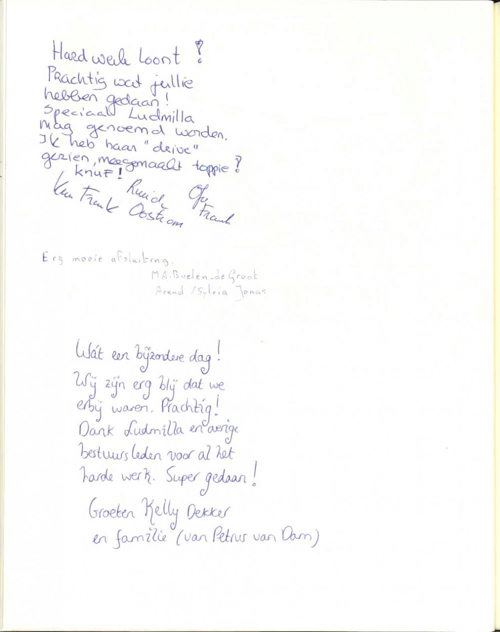 Beste mensen van het bestuur, wij zijn zeer opgetogen over de dag 7 mei jl.die zo mooi is verlopen, dank zij Uw aller inspanning enz. Geweldig kunnen wij alleen maar zeggen, ook onze kinderen en kleinkind vonden het geweldig. Dank vooral ook Mevr.Ludmille van Santen, waar wij vaak mee mailden. Groetjes van ons.