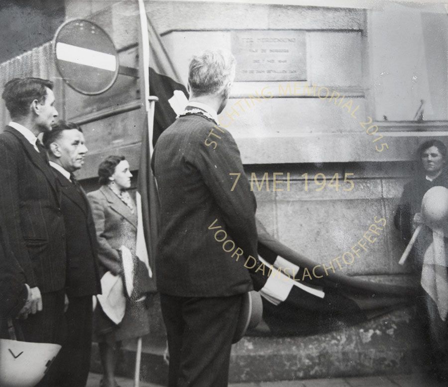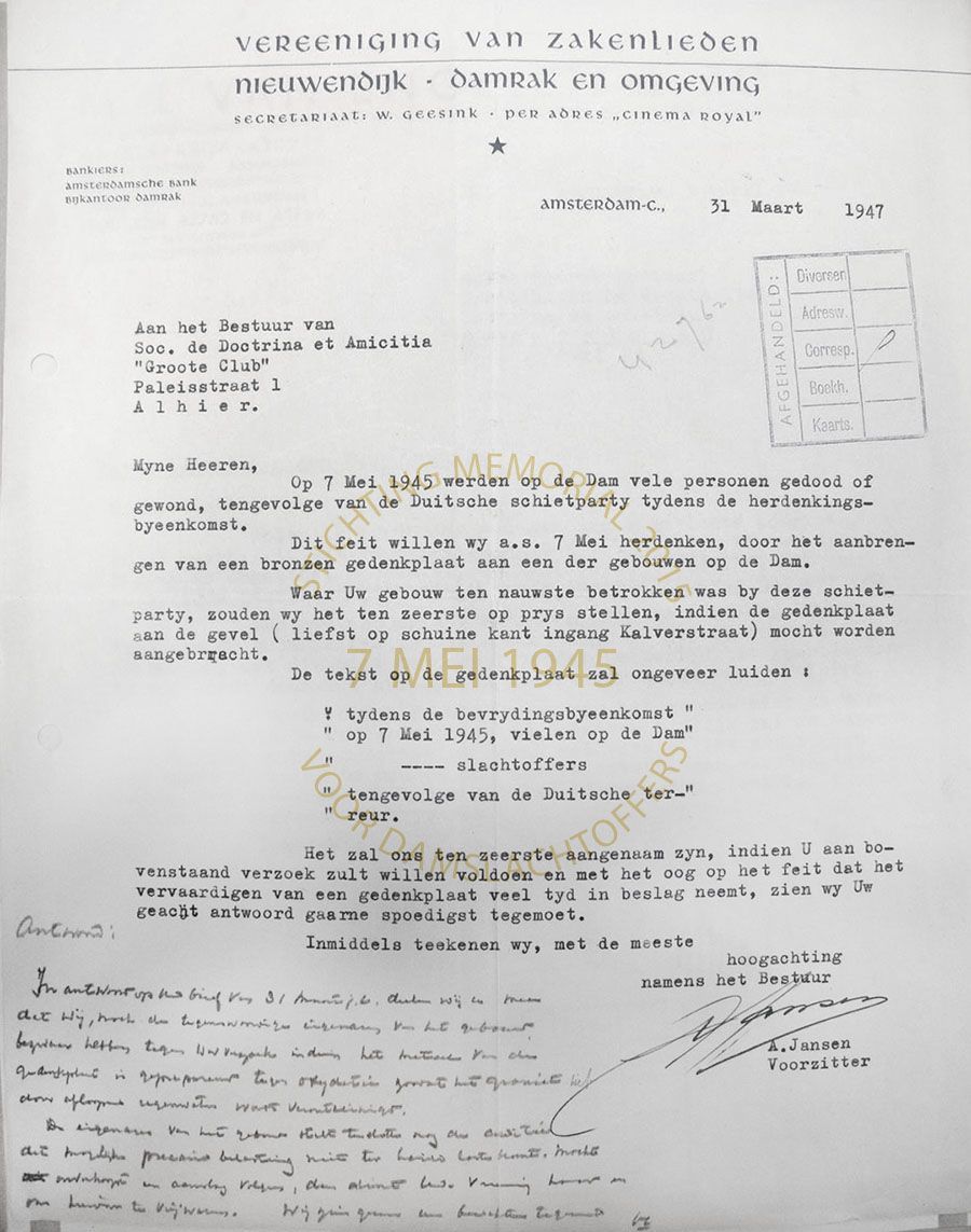 Op 7 Mei 1947 werd het huidige gedenkplaat op de Dam onthuld. Onderzoek in het stadsarchief Amsterdam heeft uitgewezen dat het initiatief van de gedenkplaat is genomen door de “Vereeniging van zakenlieden Nieuwendijk Damrak en omgeving“. Zij hebben hiervoor toestemming gevraagd en gekregen van het bestuur van Societeit de Doctrina et Amicitia Groote Club. Eind maart 1947 werd het formele verzoek ingediend bij de Groote Club, en in de concepttekst werd het aantal slachtoffers blanco gelaten.