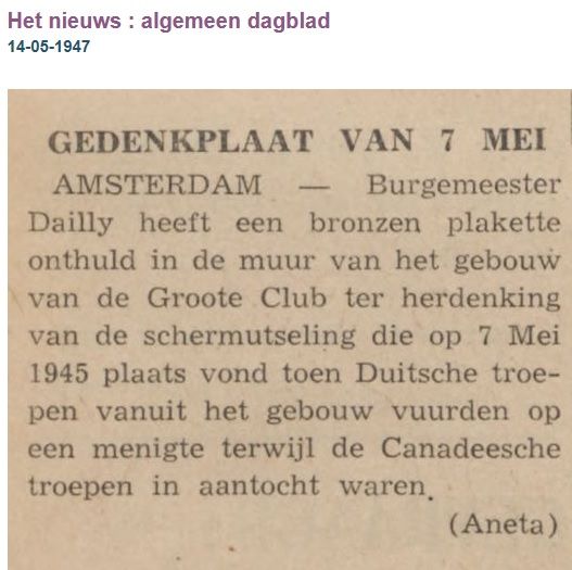 In de gevel van het gebouw de „Groote Club”, op de hoek Kalverstraat—Paleisstraat te Amsterdam, van waaruit op Maandag 7 Mei 1945, even nadat de eerste drie Canadese verkenningswagens de Dam opreden, de daarin gelegerde Duitse militairen omstreeks drie uur het vuur op de, op de Dam samengestroomde menigte, openden, onthulde gisteravond de burgemeester van Amsterdam, mr. Am. J. d’Ailly, een eenvoudige bronzen plaquette, ter nagedachtenis van de hier gesneuvelde burgers en B. S.-ers. Bij het vuurgevecht waren twee jaar geleden 19 doden en 117 gewonden te betreuren.