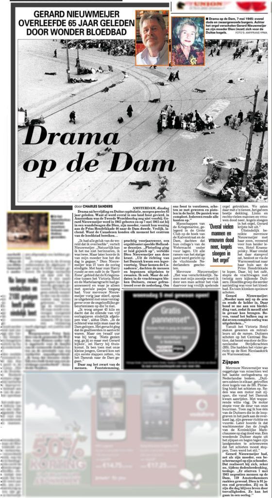 De soldaten op de truck waren Duitsers en die waren zo gefrustreerd, dat ze om ons aan het schrikken te maken, in de lucht gingen schieten. De mensen renden alle kanten op. Op hetzelfde moment, dachten de Marine soldaten, die gelegerd waren in de grote Club, dat hun collega soldaten Op de Dam werden beschoten.