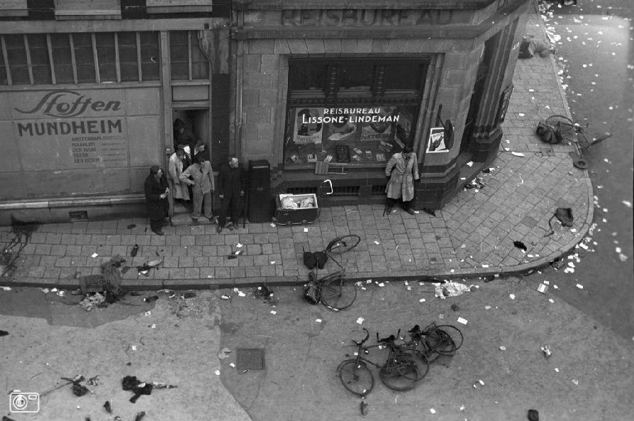 Wellicht is dit toen opgevat als een provocatie. Korte tijd later hoorde ik schoten. Een Duitse mitrailleurpost opende vanaf het dak van de Grote Club op de hoek van de Kalverstraat het vuur op de menigte.