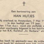 Lees verder: Ton Daems over Han HutjesHan Hutjes (26-11-1925) is met zijn ouders uit Arnhem gevlucht na de operatie ‘Market Garden’, zij kwamen lopend met een wagentje naar Amsterdam en kregen onderdak bij familie op de Admiraal de Ruyterweg. Die familie was bevriend met mijn ouders. Doordat wij leeftijdgenoten waren trokken wij veel met elkaar op. Als hij naar ons toekwam…