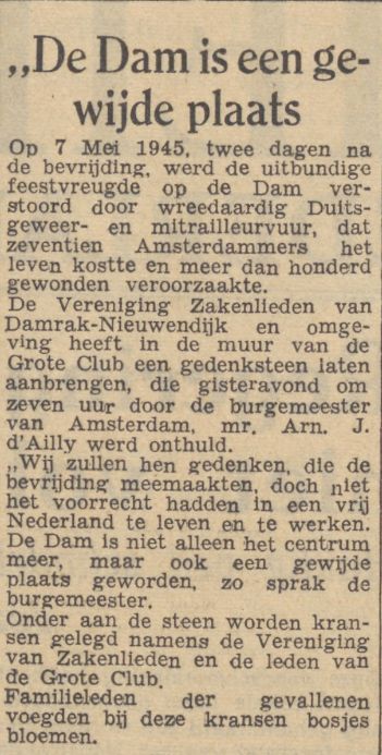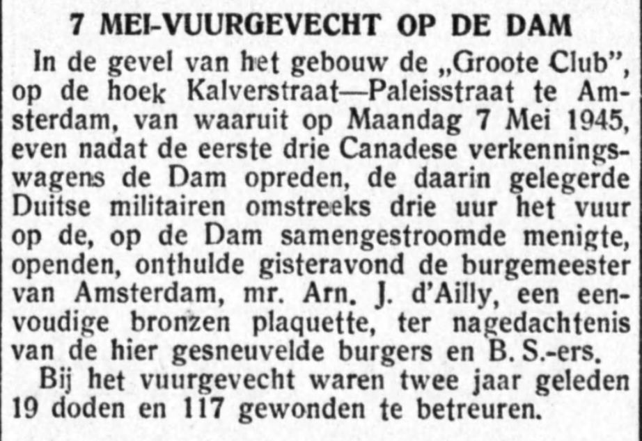 Op 7 mei 1945 vond de dramatische schietpartij op de Dam plaats. Eenheden van de Kriegsmarine schoten vanuit de ramen, balkons en het dak van de Groote Club op de feestvierende menigte en B.S. eenheden.  Op 9 mei 1945 werden deze troepen door de Canadese eenheden ontwapend en weggevoerd uit de Groote Club.