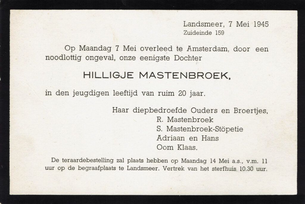 Hilligje-Mastenbroek“Hier rust onze lieve dochter en zuster Hilligje Mastenbroek oud 20 jaar. Uit dankbare herinnering van vrienden en bekenden.” Een grafsteen met deze tekst heeft jarenlang op de Landsmeerse begraafplaats gestaan als herinnering aan de op 7 mei 1945 op de Dam te Amsterdam omgekomen Landsmeerse. Hilligje Mastenbroek geboren op 7 september 1924 in Amsterdam als enige dochter van Roelof Mastenbroek en Sjoerdtje Stöpetie werd het slachtoffer van de beschietingen op de Dam. Duitse soldaten openden het vuur op de menigte vanuit het gebouw van de Groote Club. Er waren veel mensen op de been vanwege de bevrijding en de intocht van de Canadezen.