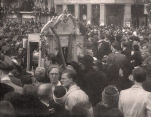 Aangekomen zagen we een enorme, dolzinnige en uitgelaten mensenmassa, zingend en dansend, het draaiorgel speelde, maar we vonden het een beetje griezelig om ons tussen al die grote mensen te begeven en het leek ons prettiger om op de stoep van het Paleis achter één van de kolommen te gaan staan kijken en dat is waarschijnlijk onze redding geweest.