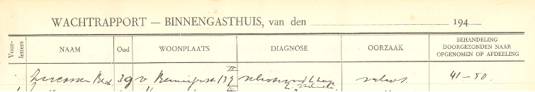 Volgens de gegevens op deze regel uit het EHBO-boekje van het Binnengasthuis, is mevrouw Lucassen-Brak binnengebracht met een schotwond linker heup.