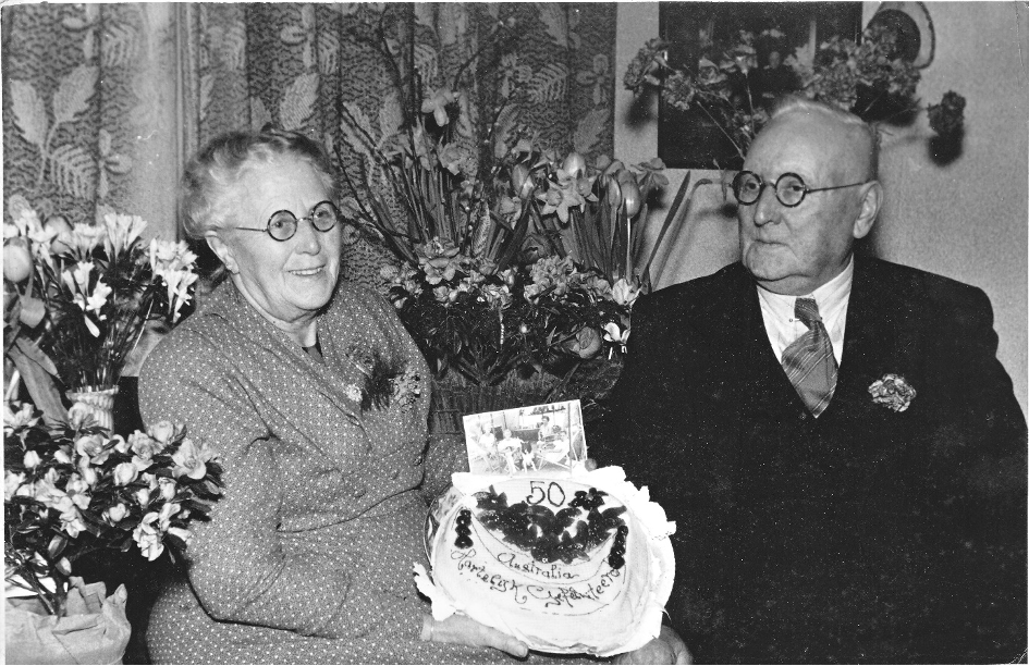 Oma en opa thuis op 9-2-1955 bij de viering van hun 50-jarig huwelijk.