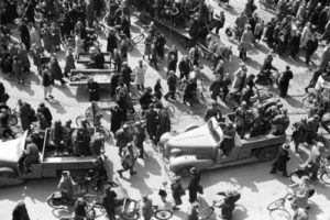 ‘Ik was met mijn moeder op weg naar mijn vader (Emiel Kretzschmar). Mijn vader speelde namelijk piano in het restaurant J.C. van Laar in de Kalverstraat, een hele chique tent. Op een gegeven moment zijn mijn moeder en ik naar de hoek van de Kalverstraat/Paleisstraat gelopen om naar de feestvierende mensen te kijken. Iedereen danste en vierde feest. Het feest stopte ineens omdat er Duitse voertuigen over de Dam reden.