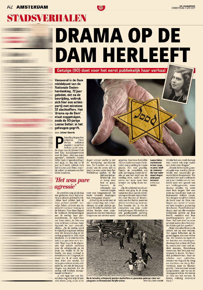 Ze weet het nog als de dag van gisteren. Haar herinnering is uiterst gedetailleerd. Maar heel zelden heb ik mijn verhaal verteld-, vervolgt Selter, zittend aan de eettafel van haar woning in de Betuwe. Voor haar liggen de tastbare herinneringen aan de oorlog: haar persoonsbewijs, de Jodenster van haar vader, de foto van toen ze 18 jaar oud was, haar dagboek en haar Zwemdiploma. Na de oorlog werd er eigenlijk nog maar zelden over die bewuste dag en de oorlog gesproken. Ook mijn kinderen en kleinkinderen heb ik er pas later over verteld. Maar toen ik de afgelopen tijd enkele verhalen over de schietpartij op de Dam las, voelde ik de behoefte om mijn verhaal te vertellen in De Telegraaf, de krant die ik al sinds 1952 lees. Juist ook omdat, als mijn generatie er straks niet meer is, we ook de herinneringen van mensen die de oorlog zelf hebben meegemaakt verliezen.”