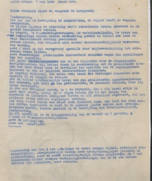 Na de onderteekening van de capitulatie te Wageningen, hield Prins Bernhard, opperbevelhebber van de Nederlandsche Binnenlandsche Strijdkrachten, de volgende, voor het pas bevrijde gebied bestemde toespraak: