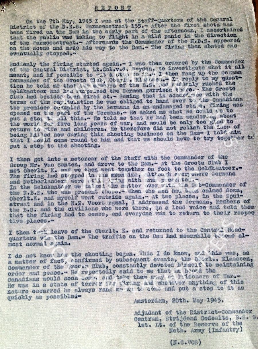 Suddenly the firing started again.- I was then ordered by the Commander of the Central District, Lt. Col.v.d. Heyden, to investigate what it all meant, and if possible to put a stop to it.- I then rang up the German Commander of the Groote Club, Oberlt. Klaassen.- In reply to my question he told me that the members of the B.S. had suddenly rushed the “Geldkantoor” and had surprised the German garrison there.- The Groote Club had besides been fired at.- Seeing that in accordance with the terms of capitulation he was obliged to hand over to the Canadians the premises occupied by the Germans in an undamaged state, firing was opened on the part of the Germans.- He asked me what we could do to put a stop to all this.- He told me that he had been wandering about the world for five long years of war, and would only too glad to return to his wife and children. He therefore  did not relish the idea of being killed now during this shooting business on the Dam- I told him that i would come round to him and that we should have to try together to put a stop to the shooting.