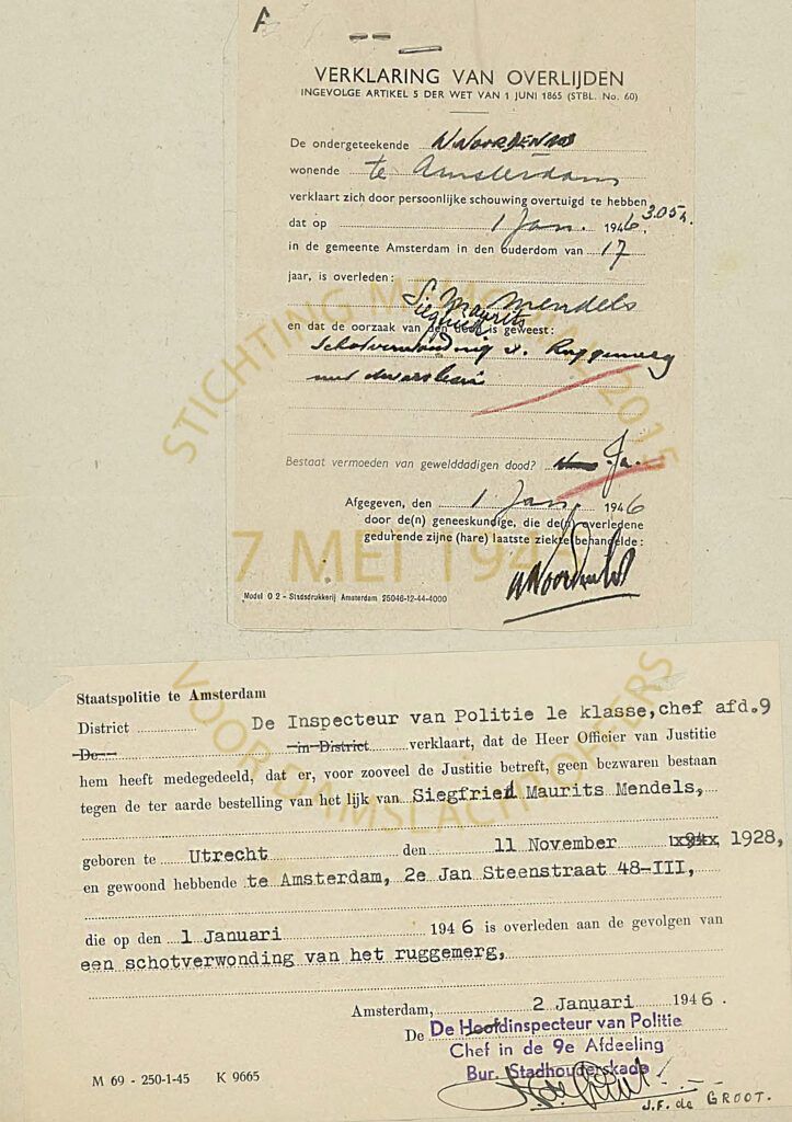 Siegfried Maurits Mendels, geboren 11 november 1928, kleermaker, woonde 2e Jan Steenstraat 48-III, naast Gerard Wiegel, en overleed op 17-jarige leeftijd op 1 januari 1946 als gevolg van ‘schotverwonding aan het ruggenmerg met dwarslaesie’ [verklaring van overlijden] in het Wilhelminagasthuis en werd begraven op Zorgvlied; het graf werd geruimd. Hij was de zoon van Willem Johannes Mendels (1894-1959) en Sara (Puck) Bueno de Mesquita (1905-1979), zij was overlevende van Theresienstadt. Siegfried had nog een broer, Max Hans Mendels (1936-1977).