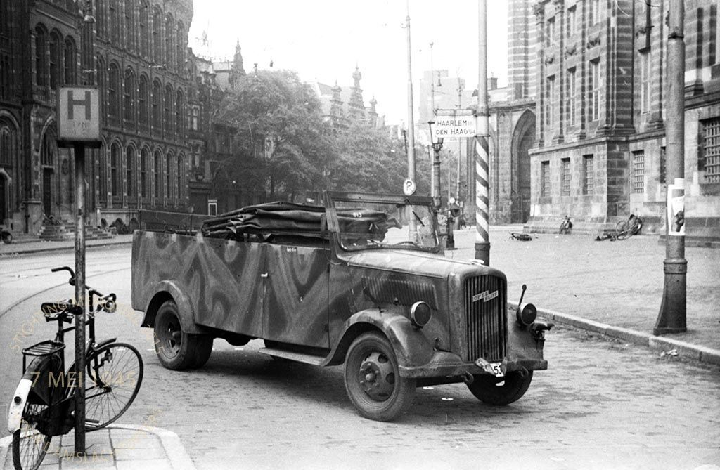 Smulders, 8 mei 1945: ‘Ik bevond mij gisterenmiddag ± 3 uur op de N.Z. Voorburgwal tusschen Paleis en Postkantoor, waar ik getuige was, hoe een duitsche legerauto met 2 inzittenden, die voor had uitgereden van het Centraal Station, werd aangehouden door manschappen van de N.B.S., bijna allen in politieuniform met helm. De duitschers werden gedwongen uit te stappen en zover als ik kon zien ontwapend. Zij werden daarna gebracht naar de achteruitgang van het Paleis, de auto bij de ingang gerangeerd.’