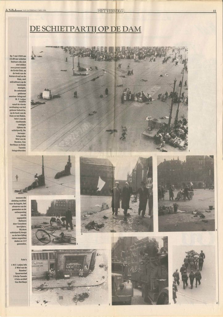 De onbekend gebleven amateur-fotograaf W.F. Leijns vanaf de vierde verdieping van het gebouw Industria, op de hoek van de Dam en het Rokin, foto’s van de vluchtende menigte tijdens de schietpartij. De beroeps-fotografen Wiel van de Randen, Cas Oorthuys en Krijn Taconis fotografeerden mensen die dekking zochten voor de kogels, het afvoeren van de gewonden en de ontwapening van de opgepakte Duitsers door Canadese bevrijders.